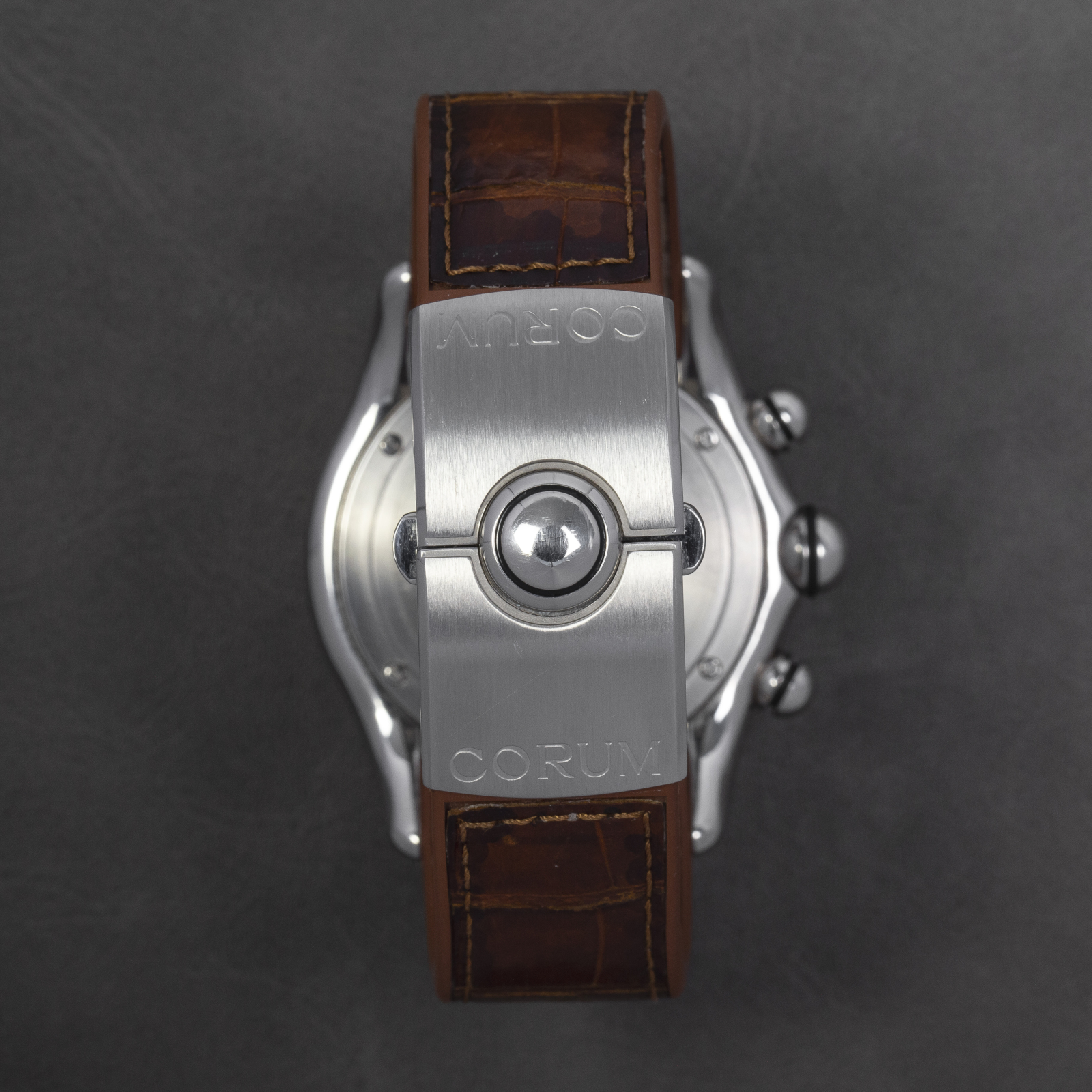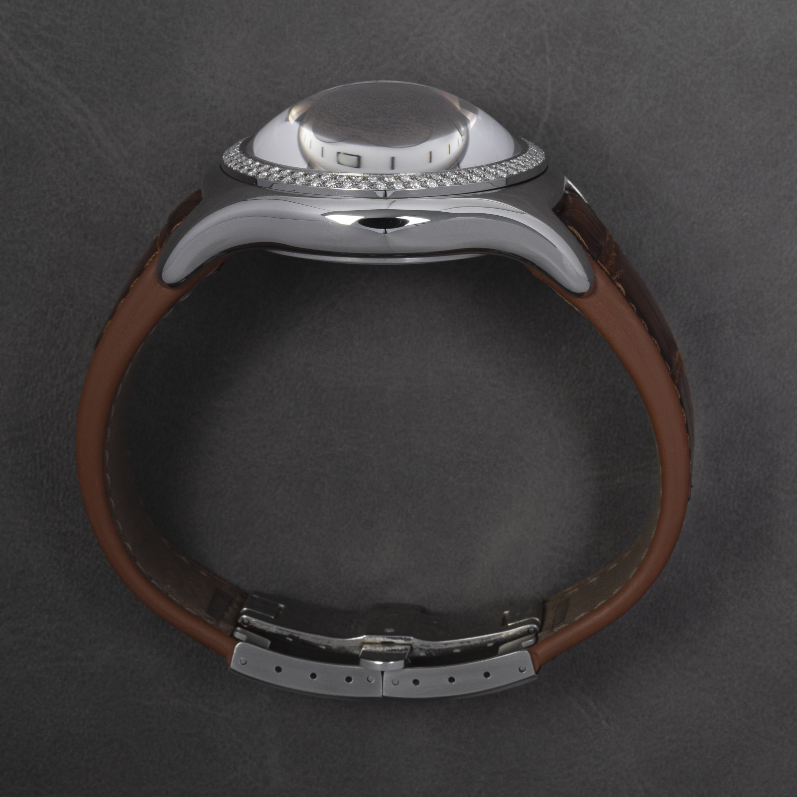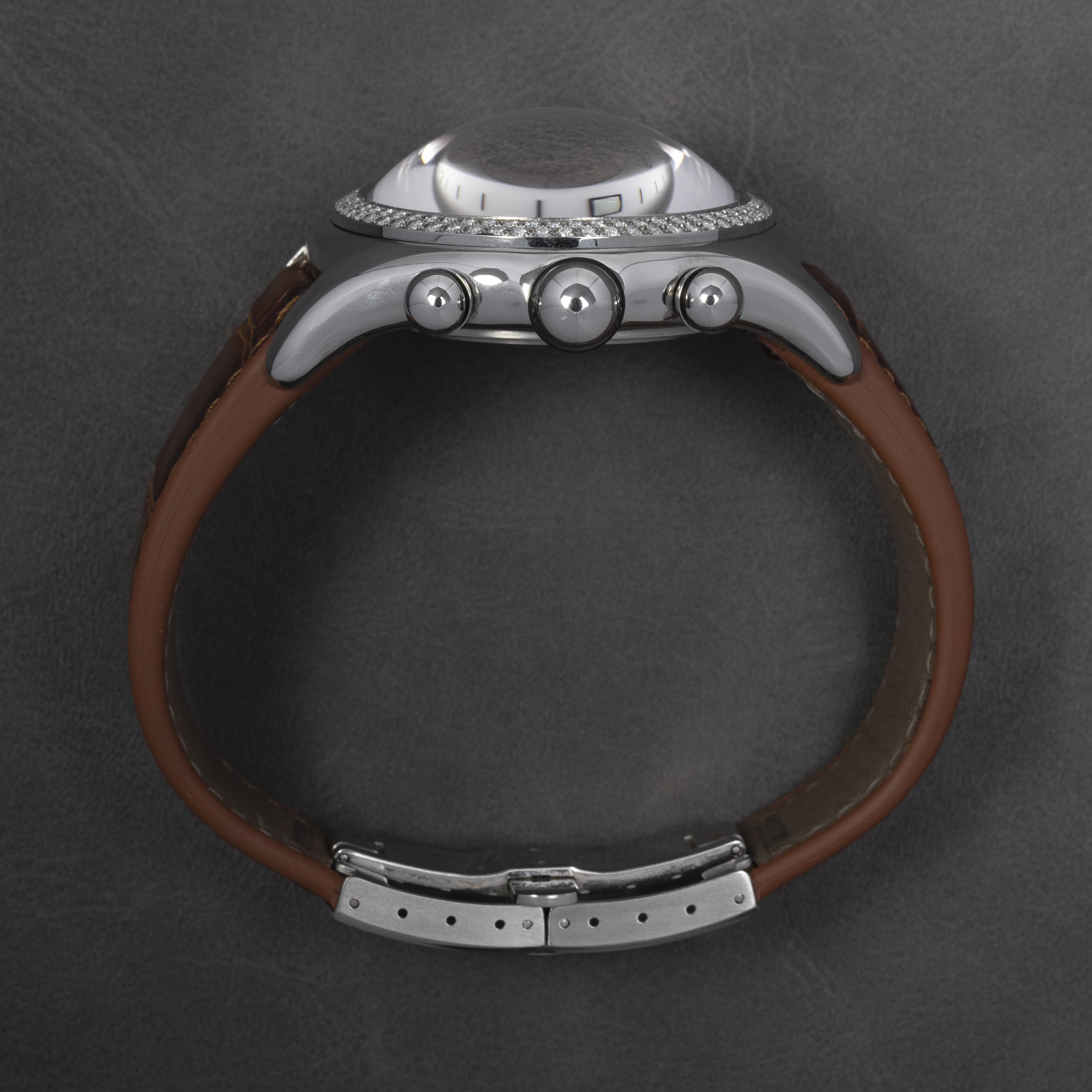 Here we have a Corum Bubble Chronograph reference. 396.157.47 with a factory diamond bezel.
